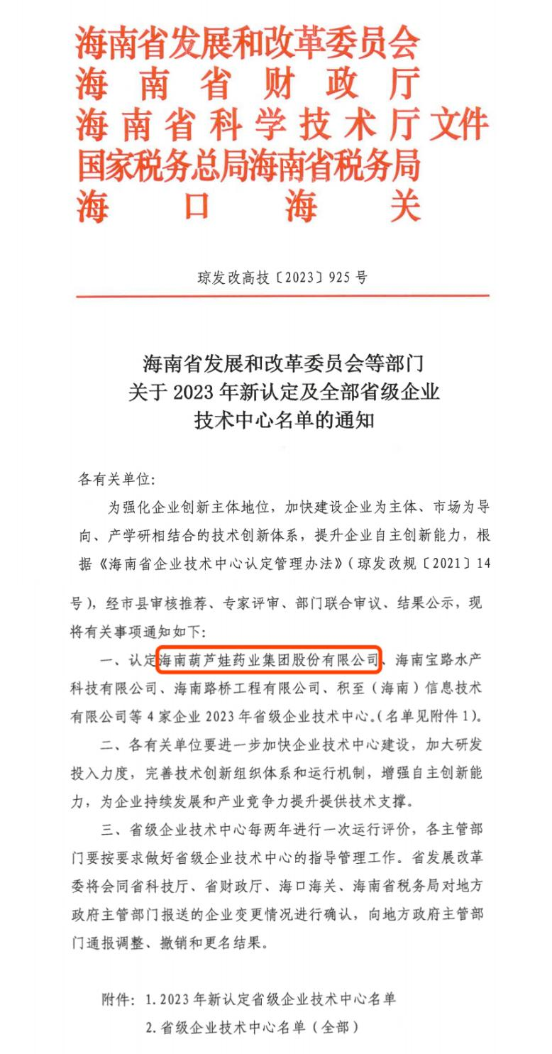近日,海南省发改委等多部门联合公布了《关于2023年新认定及全部省级企业技术中心名单的通知》,其中,海南EBpay药业集团股份有限公司成功通过评审,被认定为省级企业技术中心,是本次获批的4家企业之一。
